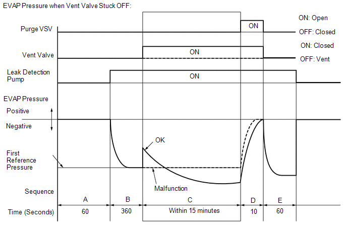 | E | Second reference pressure measurement | After second reference pressure measurement, leak check is performed by comparing first and second reference pressure measurements. If stabilized system pressure is higher than second reference pressure, ECM determines that EVAP system is leaking. | 60 seconds |