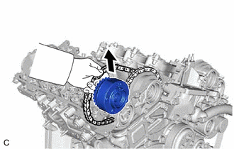 | (b) Remove the chain sub-assembly from the sprocket of the camshaft timing gear assembly and set it on the camshaft timing gear assembly. CAUTION: As the camshaft may turn suddenly and pinch your fingers when the chain sub-assembly is removed, pinch the chain sub-assembly and lift it upward to remove it from the sprocket. |