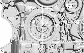 | (a) Turn the crankshaft clockwise until it is in the position shown in the illustration so that the chain sub-assembly can be installed easily. HINT: When turning the crankshaft, engine oil may spray out of the oil holes. |