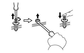 | Remove the clips by prying out the pin using a screwdriver with its tip wrapped with protective tape and then prying out the shell. |