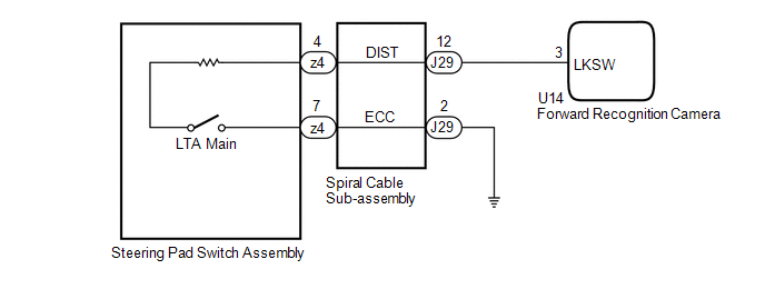The forward recognition camera receives LTA main switch signals from the steering pad switch assembly.