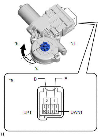 (b) Connect a negative (-) battery lead to connector terminals 1 (E) and 7 (DWN1) or 10 (UP1).