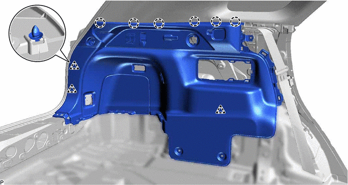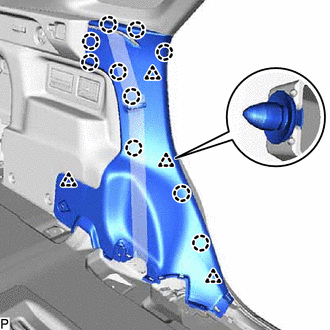 | (a) Using a clip remover, remove the 6 clips to disconnect the rear No. 2 seat assembly. |