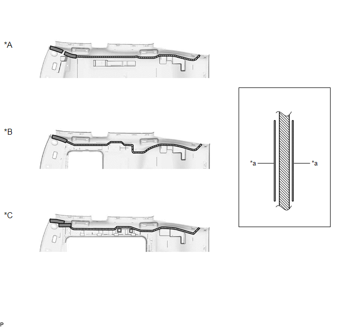 (h) Align the edge of the marking tape (C) on the No. 1 roof wire with the markings on the roof headlining assembly.