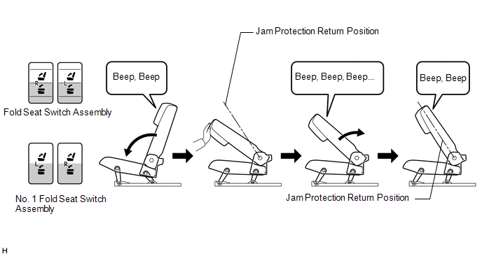 (2) While the return operation is being performed, push the back of the seatback and check that a buzzer sounds continuously while the seatback operates in the reverse direction. Check that when the seatback stops operating in the reverse direction, the buzzer sounds.