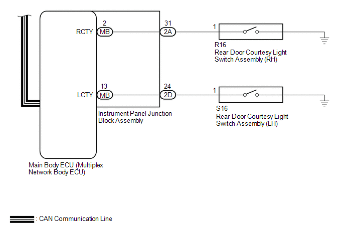 The main body ECU (multiplex network body ECU) detects whether either rear door is open or closed based on the condition of the left and right courtesy light switches and then sends the rear door status signal to the combination meter assembly. The combination meter assembly detects the rear seat belt state. The rear seat belt warning lights on the radio receiver assembly illuminate or turn off in accordance with the rear door state, vehicle speed and rear seat belt state.