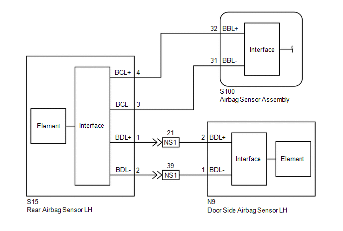 The side collision sensor LH circuit (bus 1) consists of the airbag sensor assembly, door side airbag sensor LH and rear airbag sensor LH.