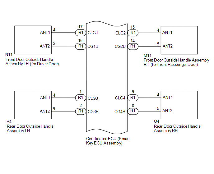 | Rear door outside handle assembly | Receives request signals from the certification ECU (smart key ECU assembly) via the built-in electrical key antenna (rear door) and forms the vehicle exterior detection area. Uses the built-in touch sensor (lock sensor/unlock sensor) to detect the operation of the rear door outside handle assembly and sends signals to the certification ECU (smart key ECU assembly). |