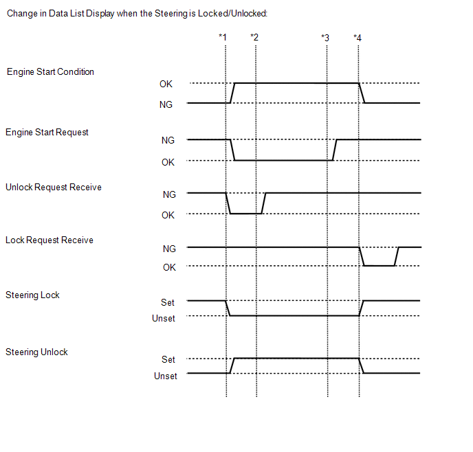 | Steering Lock Start Cond | Steering lock ECU wake up signal status | No or Yes | No: Wake up signal not sent Yes: Wake up signal sent | - |